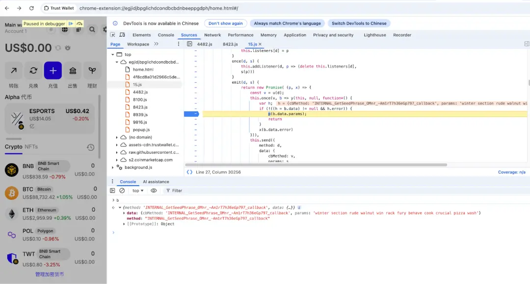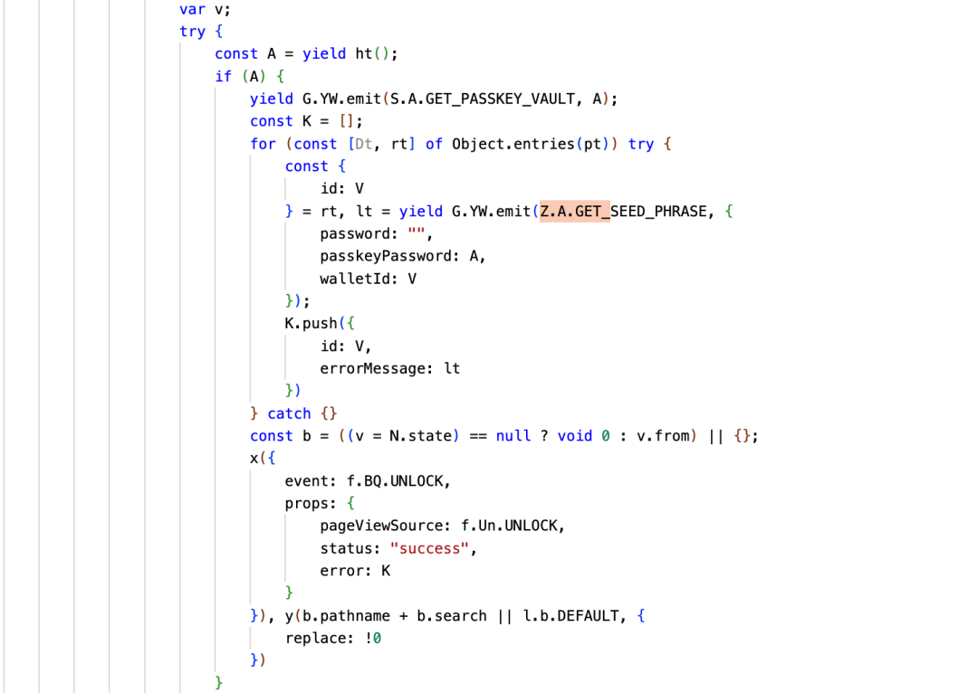 The malicious code iterates through all wallets in the plugin and sends a "get mnemonic phrase" request to each user's wallet to obtain the user's encrypted mnemonic phrase. Finally, it decrypts the mnemonic phrase using the password or passkeyPassword entered by the user when unlocking the wallet. If decryption is successful, the user's mnemonic phrase is sent to the attacker's domain `api.metrics-trustwallet[.]com`.