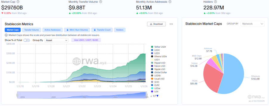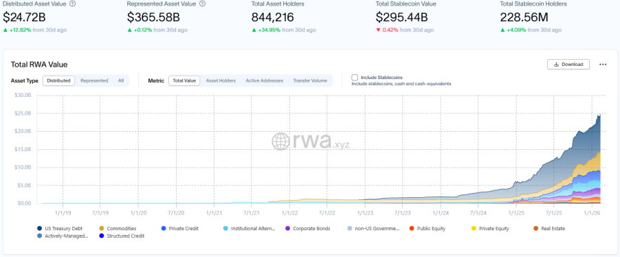 RWA.xyzが公開した最新データによると、2026年2月13日時点で、RWAオンチェーンの総時価総額は247.2億米ドルに達し、前月同期比12.82%増となり、急成長を続けています。資産保有者総数は約844,200人で、前月同期比34.95%増と大幅に増加し、資産規模の成長率をはるかに上回り、ユーザーベースは拡大を続けています。