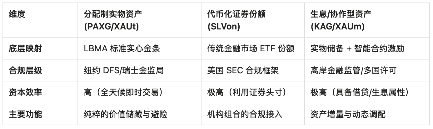 通过对目前主流 RWA 项目的调研,我们可以根据其底层架构和功能属性,将链上贵金属划分为三个互补的投资赛道,并探讨其相对于传统模式的代差优势。