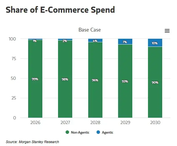 モルガン・スタンレーは、2030年までにエージェンティックコマースによって米国の電子商取引支出が1,900億ドルから3,850億ドルに達し、市場浸透率が10%から20%になると予測しています。