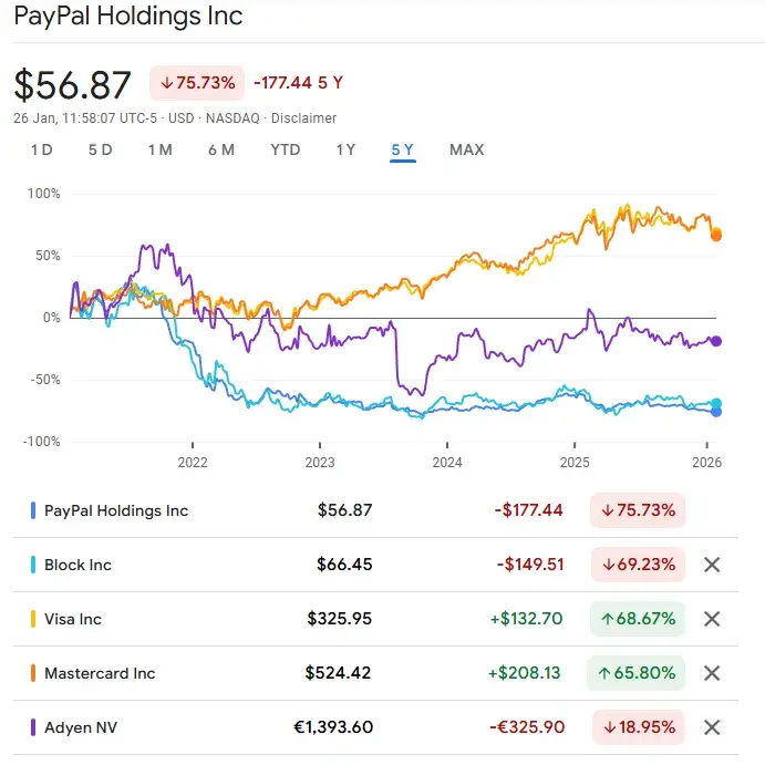 PayPalの株価はここしばらく低迷しており、52週間の高値から約37%下落しています。投資家は、同社が長期的に見て構造的な重要性を維持しているかどうか疑問視しており、暗号通貨とAIの融合に関する議論の高まりは、こうした懸念をさらに悪化させています。