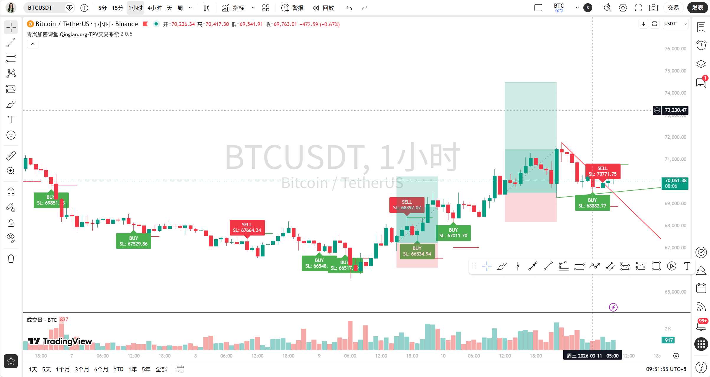 可能出现的反转形态: 目前在短周期上,如果价格能在70000美元上方企稳并向上突破70500美元,形成一个小的W底或头肩底形态,那么短线可能会有一波快速反弹。但如果跌破69000美元,那么回调可能会延续到4小时图的MA20,甚至更低。