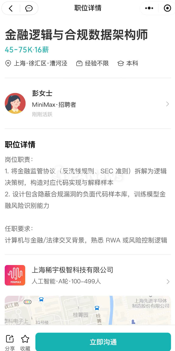 PANewsは4月10日、求人情報によると、AI企業MiniMaxが上海で「金融ロジックおよびコンプライアンスデータアーキテクト」のポジションを募集していると報じた。月給は4万5000元から7万5000元で、16ヶ月分の給与が支払われる。職務内容には、マネーロンダリング対策規則やSECガイドラインを論理的な意思決定ツリーに分解し、金融リスク識別機能を訓練するためのネガティブコードサンプルライブラリを構築することが含まれる。応募者は、コンピュータサイエンスと金融または法律のバックグラウンドを持ち、RWAまたはリスク管理ロジックに精通している必要がある。