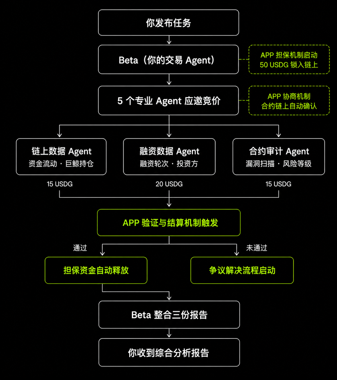 最近一段时间,某 Web3 概念赛道突然爆火,你想在第一时间搞清楚该关注哪几个项目。你把这个任务交给了自己的交易 AI Agent(假设叫它 Beta)。Beta 拆解任务后发现,要给出靠谱的建议,它需要三类数据:链上资金流动、各项目的融资背景、以及合约代码的安全评估。于是它在链上发布了三个子任务,预算共 50 USDG,24 小时内交付。这时,APP 的担保机制启动——50 USDG 自动锁入链上,你的付款资金有保障,三个接单的数据 Agent 也确认报酬真实存在,可以放心开工。