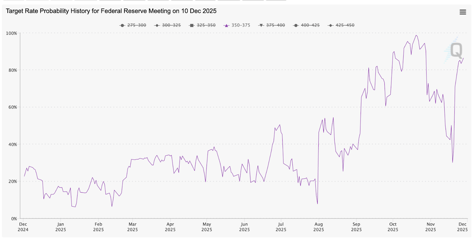 10月初旬(連邦準備制度理事会(FRB)の会合3週間前)にBinanceなどの取引所でシステム障害が発生したことを受け、暗号資産市場は最初の下落に転じました。しかし、市場は概ね11月の下落の主な要因は、FRB議長ジェローム・パウエル氏のタカ派的な発言にあると捉えていました。11月を通して、12月の利下げに対する市場予想は100%近くから30%まで急落し、株式市場と暗号資産市場は共に月を通して下落傾向を維持しました。