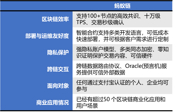 对上述区块链平台以不同维度做横向对比,我们发现在区块链效率方面,五大平台均可以支持万级的TPS吞吐量,其中蚂蚁链可以支持的TPS达到了十万级;在部署与运维、隐私保护、跨链交互等方面五大平台的区别不大;而在区块链服务面向的对象方面,五大平台一般是面向企业提供服务的,但蚂蚁链和腾讯区块链也可以面向个人提供服务,通过支付宝认证的个人也能享受蚂蚁链的服务让未来“全民上链”有了极大的可能性。