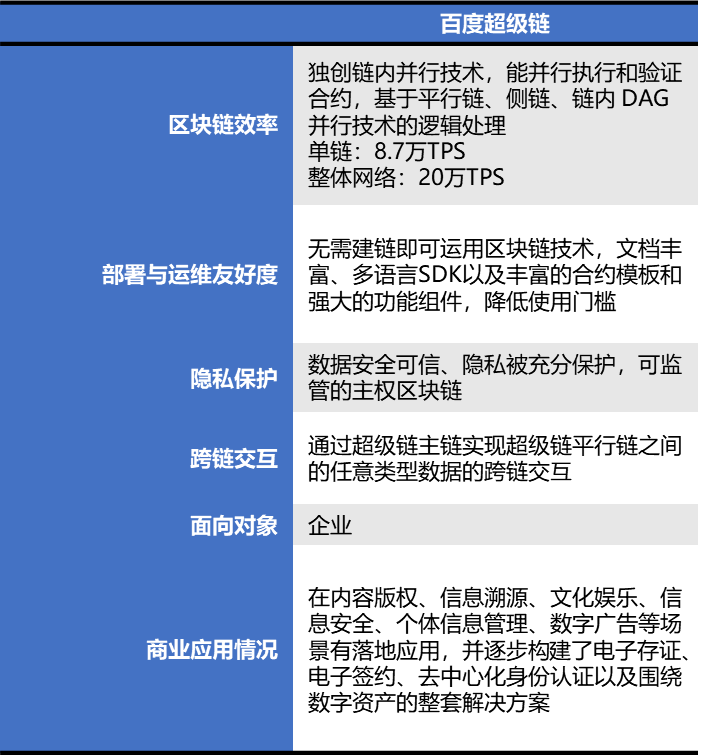 蚂蚁链的特点是区块链技术的综合应用已经可以覆盖超过50种场景;百度超级链的特点是注重区块链对版权和信息安全的应用;腾讯区块链除了应用于电子发票,还特别应用于游戏场景;京东智臻链虽然也注重综合应用,但更侧重溯源;趣链的区块链平台则多应用于大型商业银行和地方政府。