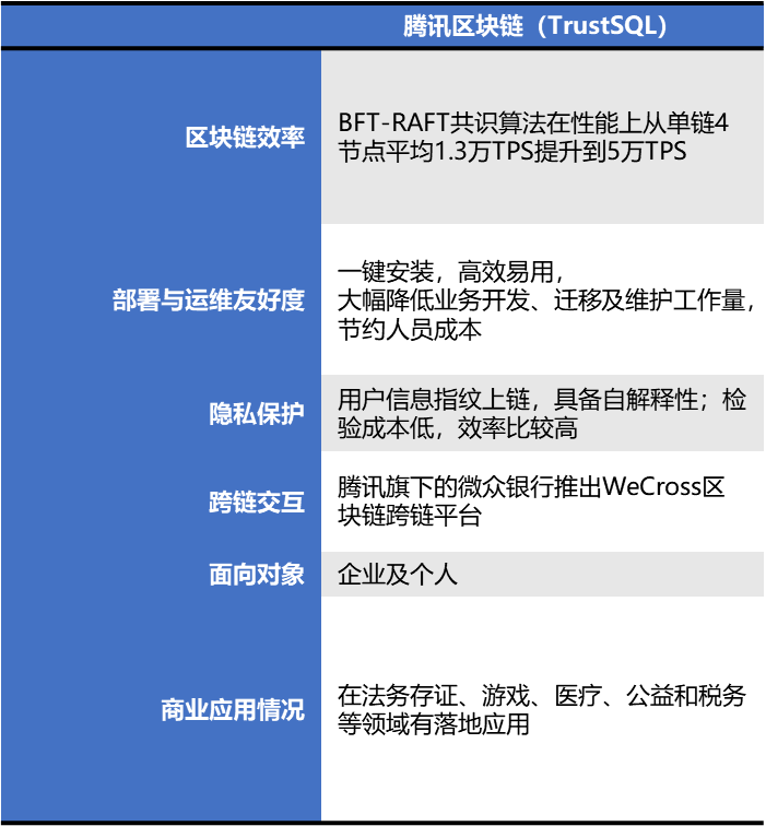 腾讯自研的区块链底层平台即TrustSQL,腾讯区块链延续了腾讯近几年主打“开放”与“赋能”的思路,专注于建设自主可控的区块链基础设施,加速实现产业场景与区块链的价值连接,助力产业区块链的持续健康发展。