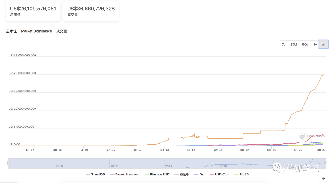 稳定币是加密领域最重要的赛道之一,因为它可以解决加密货币波动性过大的问题,在DeFi中有越来越广泛的应用。这在市值上也体现了出来。从2020年以来,稳定币的整体市值增长非常迅猛,如今超过260多亿美元。