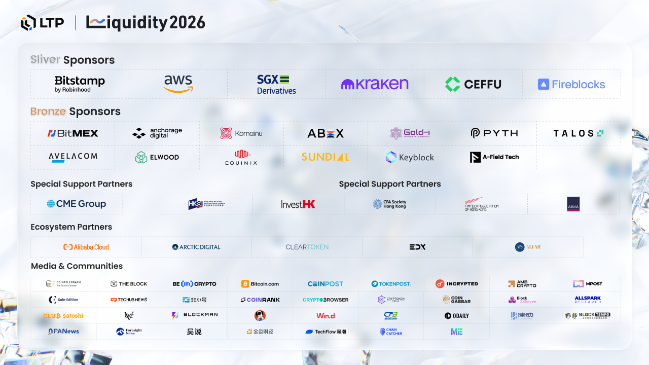 今年のサミットは、世界をリードする機関投資家、市場インフラプロバイダー、そして業界団体から力強いご支援を賜り、大変光栄に存じます。シルバースポンサーであるBitstamp(Robinhood)、AWS、SGX、Kraken、Ceffu、Fireblocksは、これらの機関投資家が取引、カストディ、クラウドサービス、そして市場インフラに深くコミットしていることを実証しています。ブロンズスポンサーであるBitMEX、Anchorage、Komainu、ABEX、Gold-i、Pyth Network、Talos、Avelacom、Elwood、Equinix、Sundial、Keyblock、A-Field Techは、執行、接続性、カストディ、リスク管理、機関投資家向け取引テクノロジーといった主要分野における専門知識を結集します。さらに、Liquidity 2026は、特別パートナーであるCMEグループに加え、HKSI、InvestHK、CFA Institute、AIMA、そして香港フィンテック協会(FTAHK)といったサポートパートナーからもご支援を賜っております。マルチアセットおよびデジタル市場インフラストラクチャに関する将来を見据えた対話を推進する包括的な制度的環境を構築してくれた、EDX、Alibaba Cloud、Arctic、ClearToken、Certik、AlfaR などのエコシステム パートナーに感謝します。