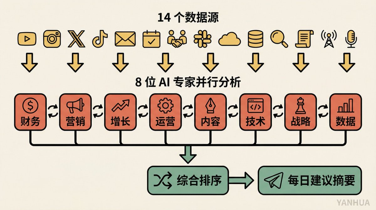 데이터 입력: 14개의 비즈니스 데이터 소스. YouTube 분석, Instagram 게시물 참여도, X Analytics, TikTok 데이터, 이메일 캠페인, 회의록, Cron 작업 상태, Slack 메시지 등 그의 비즈니스 전반을 아우르는 데이터입니다.