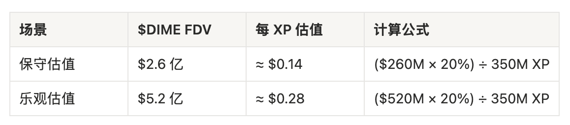 XP 가치 평가 추정치 ($DIME의 완전 희석 시가총액 예측 기준): Whales Market 분석 보고서에 따르면, $DIME의 완전 희석 시가총액(FDV)은 2억 6천만 달러에서 5억 2천만 달러 사이로 예상됩니다. 시즌 2에서 배포된 약 4억 5천만 XP(에어드롭 풀의 대부분을 차지)를 고려하면, XP당 잠재적 가치는 다음과 같이 추정할 수 있습니다. 참고: 이는 이론적인 계산이며, 실제 에어드롭 가치는 최종 TGE 가격과 구체적인 할당 계획에 따라 달라집니다.