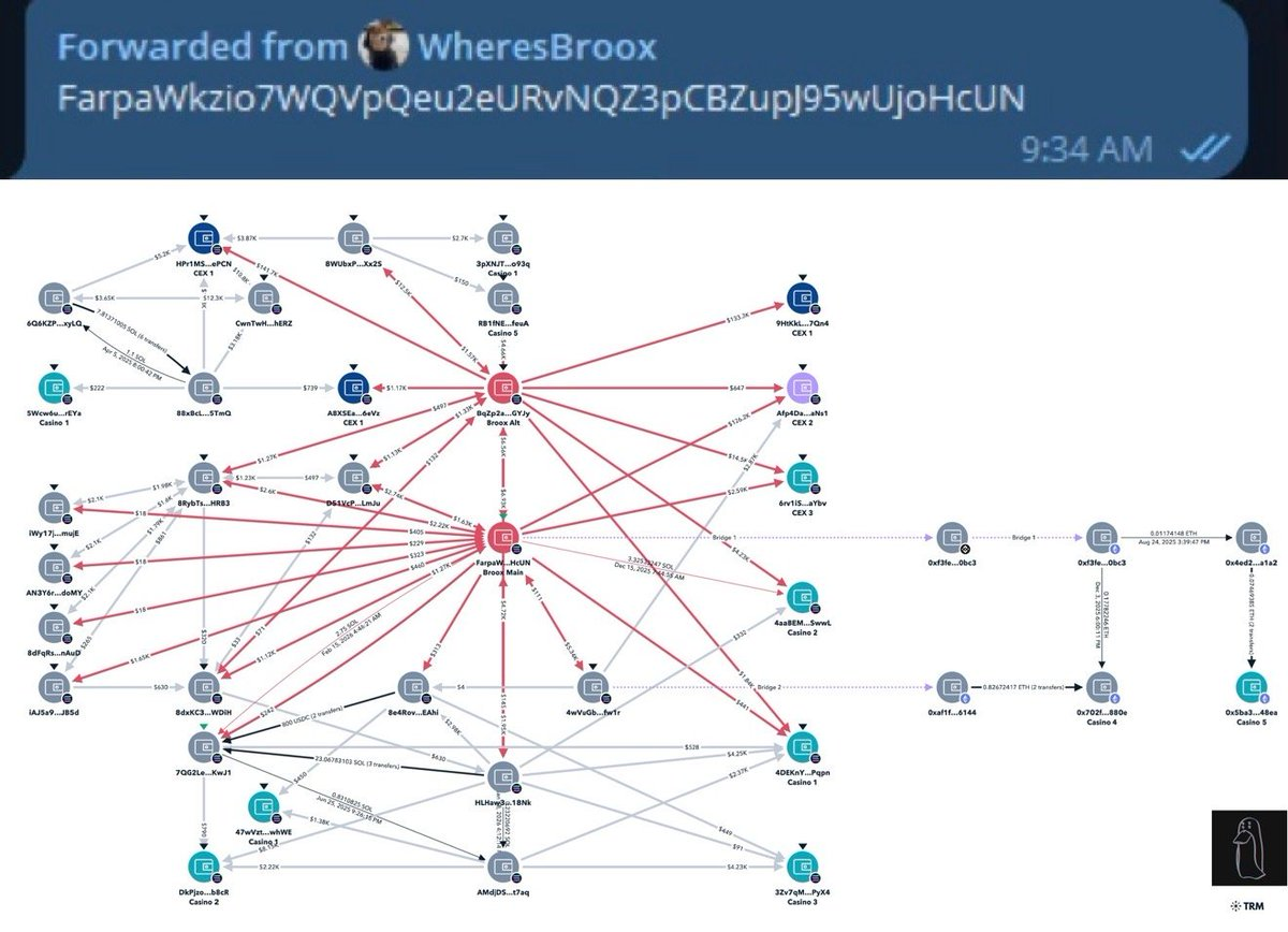 @WheresBroox 는 내부자 거래에 연루된 @AxiomExchange 팀 직원 중 한 명입니다. 2025년 초부터 이들은 회사 내부 도구에 대한 접근 제어 부족을 악용하여 민감한 사용자 정보에 비공개로 접근하고 개인 지갑 활동을 추적하는 방식으로 내부자 거래에 가담했습니다.
