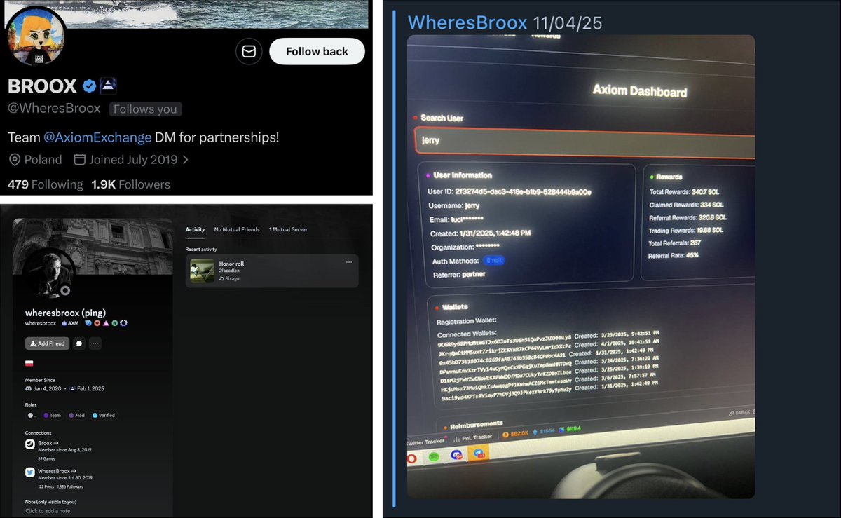 2025년 4월, 브룩스는 액시엄의 내부 백엔드 화면 캡처 이미지를 게시했는데, 여기에는 거래자 "제리"의 개인 지갑 정보가 나와 있었습니다.