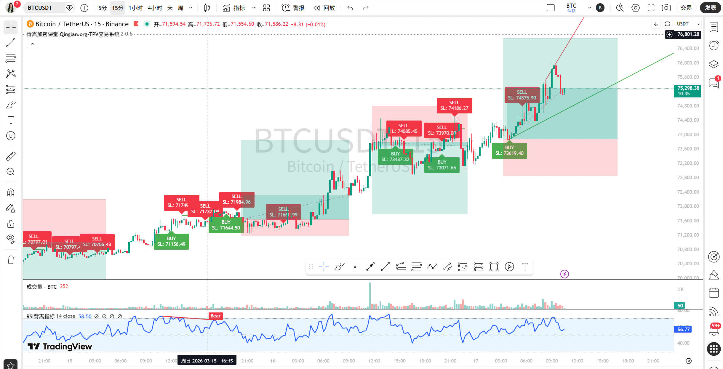 • 逆势机会(谨慎):如果价格冲到75900-76000附近,15分钟或1小时RSI出现顶背离(价格新高,RSI走低),可以极小仓位尝试短空,止损76200,目标看75200-74800。这是刀口舔血,新手别碰!