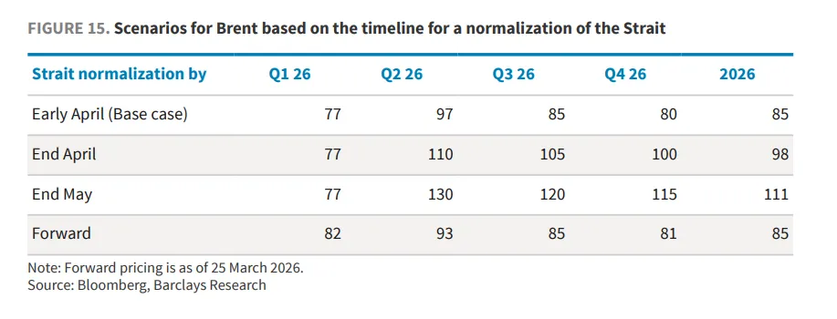 바클레이즈는 유가 추세가 세 가지 핵심 지점에서 차이를 보일 것으로 예상합니다. 호르무즈 해협의 정상적인 항행이 4월 초에 재개될 경우, 바클레이즈는 2026년 브렌트유 평균 가격을 배럴당 85달러로 예상하는 기존 전망을 유지합니다. 만약 4월 말까지 지연될 경우, 평균 가격은 배럴당 약 98달러 수준으로 재조정될 수 있습니다. 그리고 5월 말까지 지연될 경우, 평균 가격은 배럴당 111달러까지 상승할 수 있습니다. 지연되는 하루하루가 누적되어 재고 부족 현상이 눈덩이처럼 불어나면서 가격 중심을 끌어올릴 것입니다.