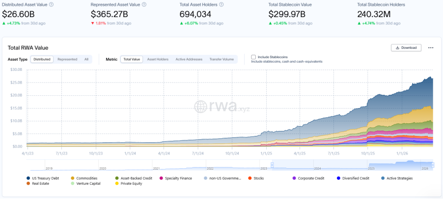 RWA.xyz가 공개한 최신 데이터에 따르면, 2026년 3월 27일 기준 RWA 블록체인의 총 시가총액은 266 억 달러로 꾸준한 성장세를 유지하며 전월 대비 4.73 % 증가하여 블록체인 확장의 주요 동력이 되었습니다. 자산 보유자 수는 약 69만 4천 명 으로 전월 대비 6.07 % 증가하여 자산 규모 증가율을 상회했습니다.