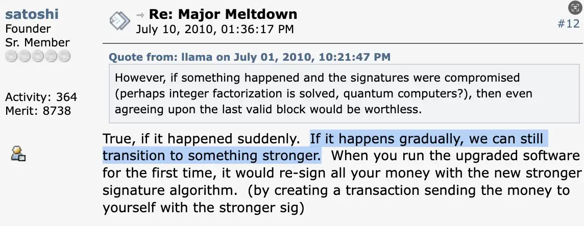 PANews는 4월 1일 사토시 나카모토가 2010년 포럼 게시글에서 양자 컴퓨팅에 대해 언급했다고 보도했습니다. 양자 컴퓨팅이 서명 알고리즘을 해킹할 위험성에 대해 그는 만약 이러한 일이 점진적으로 발생한다면 소프트웨어 업그레이드를 통해 더욱 안전한 서명 방식으로 전환할 수 있다고 주장했습니다. 사용자가 업그레이드된 소프트웨어를 처음 실행할 때, 새로운 서명 알고리즘을 사용하여 모든 자산에 다시 서명하면 된다는 것입니다 (즉, 자산을 자신에게 보내는 거래를 생성하고 더 강력한 서명을 사용하면 됩니다).