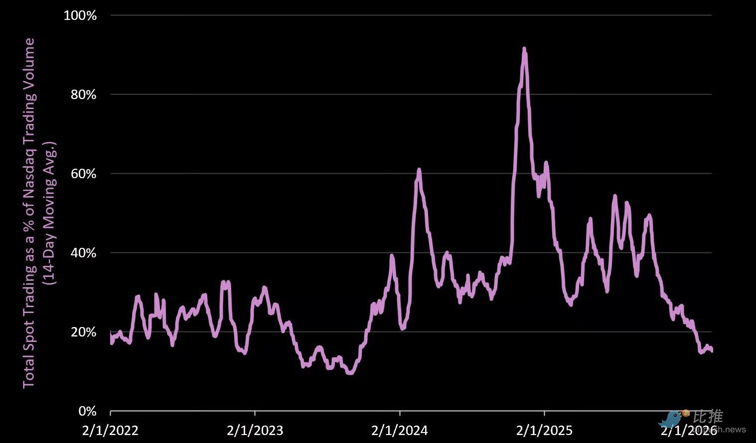 지난 호황기에서 덜 알려진 사건 중 하나는 작년 1월 "밈 열풍" 당시 암호화폐 거래량이 나스닥에 압력을 가했던 일입니다. 당시 암호화폐 거래량은 거의 세 배 가까이 증가하여 하루 900억 달러에 달했고, 이는 당시 나스닥 전체 거래량의 90%를 차지했습니다.