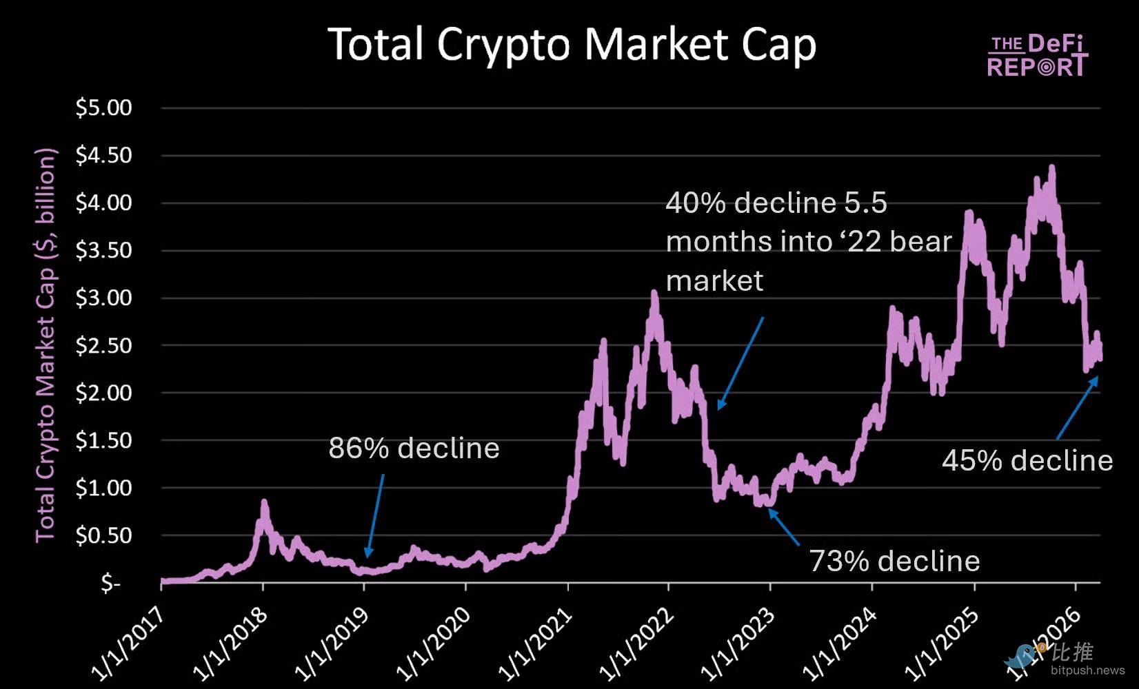 위 차트에서 볼 수 있듯이 현재 암호화폐의 총 시가총액은 2조 4천억 달러로, 최고점(4조 4천억 달러) 대비 45% 하락했습니다. 이는 지난번 약세장 당시 5.5개월 동안 지속된 하락폭(40%)과 거의 비슷한 수준입니다.