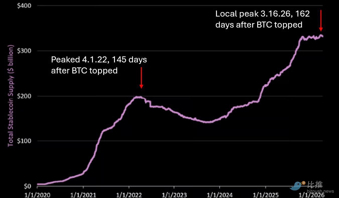 2022년 약세장에서는 스테이블코인 공급량이 정점을 찍고 감소하기 시작한 후 5개월 만에 하락세가 가속화되었습니다. 현재 우리는 비슷한 국면에 있으며, 스테이블코인 공급량은 약세장 시작 후 약 5개월 만인 3월 16일에 단기 고점을 기록했습니다. 이에 대해서는 나중에 더 자세히 논의하겠습니다.
