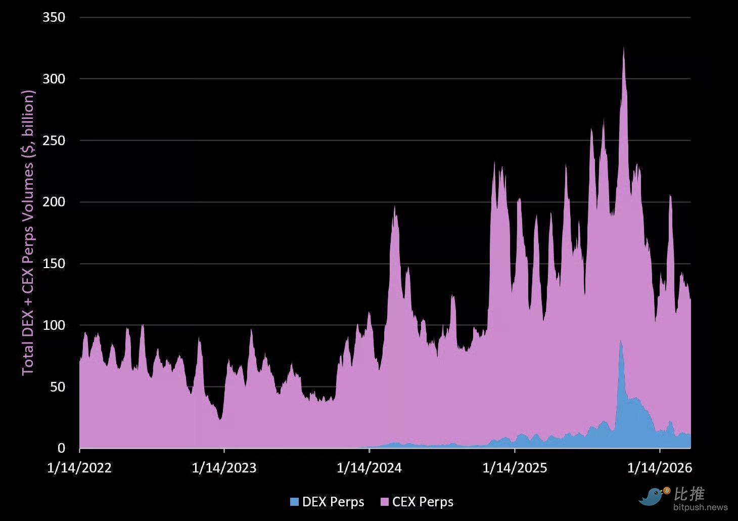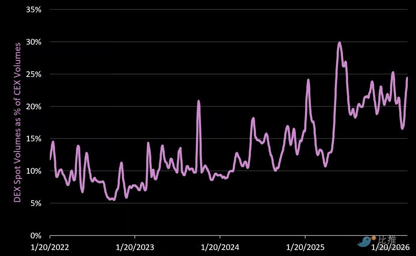 현재 탈중앙화 거래소(DEX) 무기한 계약 거래량은 중앙화 거래소(CEX) 무기한 계약 거래량의 9.3%를 차지하며, 이는 2025년 초 4%에서 증가한 수치입니다.