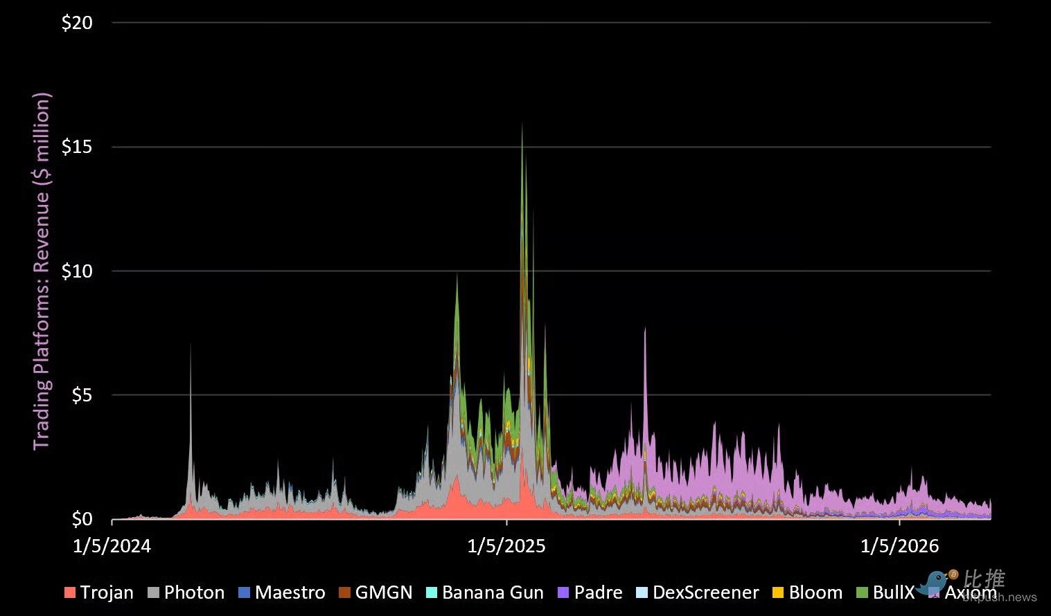 거래 봇/애플리케이션은 지난 시장 주기에서 가장 성공적인 애플리케이션 중 하나였습니다. 한때 하루에 1천만 달러 이상의 수익을 창출하기도 했습니다. 하지만 총 수익은 2025년 초 최고치에서 94% 감소했습니다.