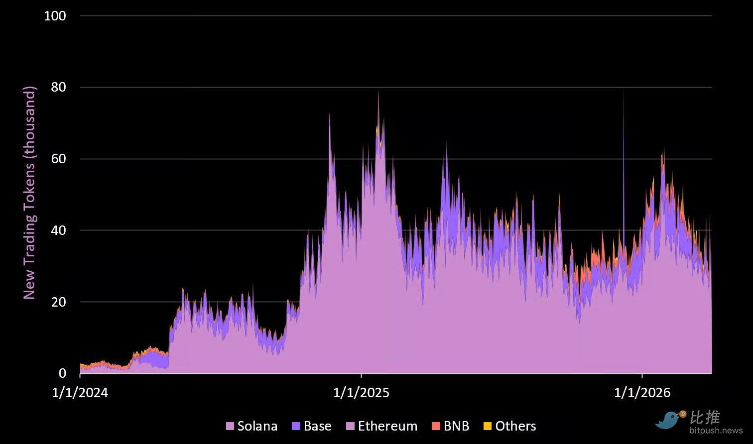 신규 토큰 거래 건수는 2025년 초 최고치 대비 53% 감소했습니다.