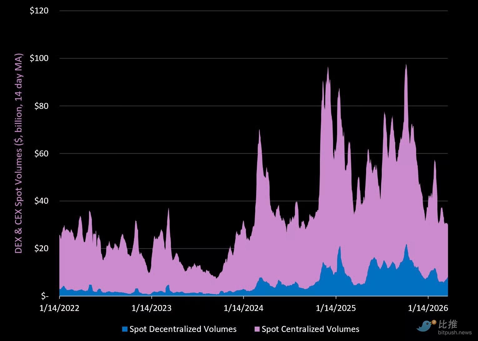 CEX 현물 거래량은 현재 2003년 초 최저점 대비 1.5배 높습니다. DEX 거래량은 현재 2003년 초 최저점 대비 9.1배 높습니다.