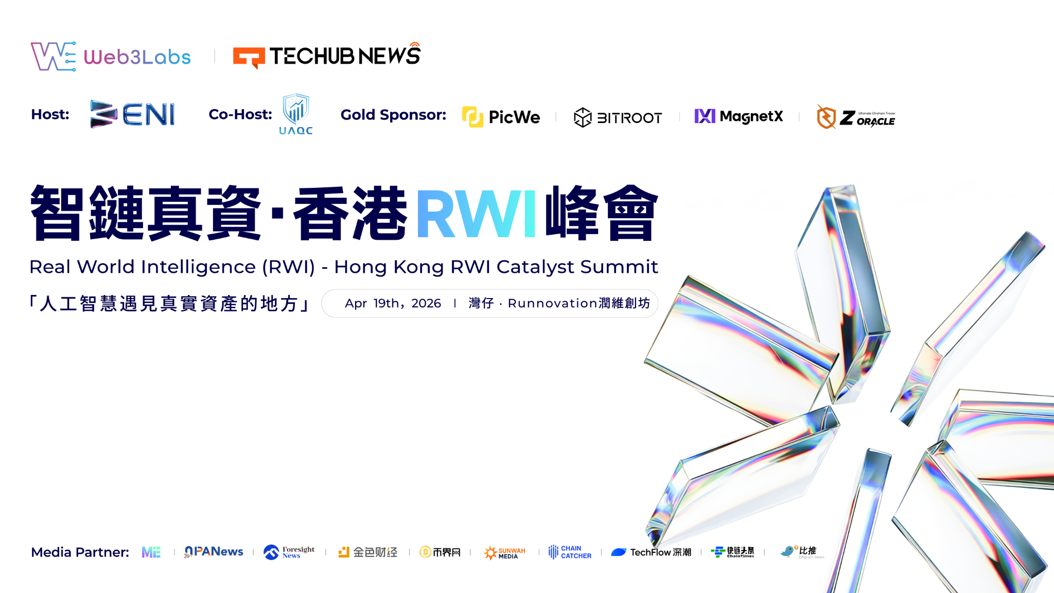 홍콩, 2026년 4월 19일 – 올해 웹3 페스티벌의 핵심 부대 행사인 “스마트 체인 실물자산 · 홍콩 RWI 서밋”이 런웨이 혁신센터에서 성공적으로 막을 내렸습니다. “AI와 실물자산의 미래 촉진”을 주제로 열린 이번 서밋은 AI와 실물자산(RWA)의 심층적인 통합에 초점을 맞췄습니다. ENI 네트워크가 주최하고 UAQC가 공동 주관했으며, Web3Labs와 Techub News가 공동으로 기획하고 Picwe, Bitroot, MagnetX, Z Oracle이 적극적으로 지원했습니다.