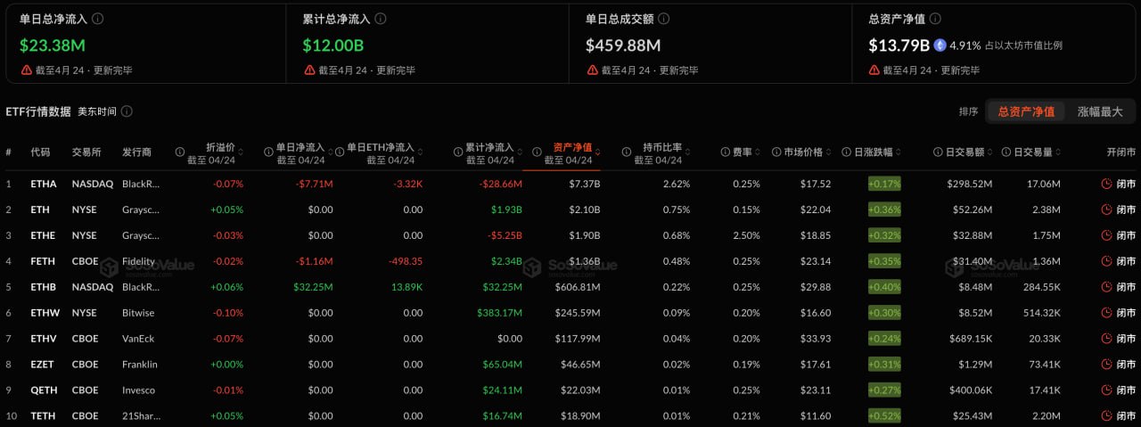 PANews는 4월 25일 SoSoValue 데이터에 따르면 이더리움 현물 ETF에 어제(4월 24일 미국 동부시간) 총 2,338만 7천 달러의 순유입이 있었다고 보도했습니다.