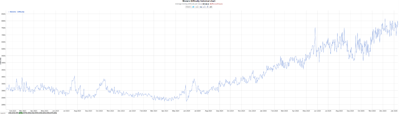 과거 채굴 난이도 추이는 일반적으로 암호화폐 생태계에 대한 자본 참여 열기를 반영합니다. 데이터에 따르면 XMR의 채굴 난이도는 2024년 말부터 급격히 상승하기 시작하여 2025년 상반기 내내 빠른 증가세를 유지했습니다. 9월과 11월 사이에 다소 변동이 있었지만, 최근 새로운 난이도 상승세가 시작되었습니다.