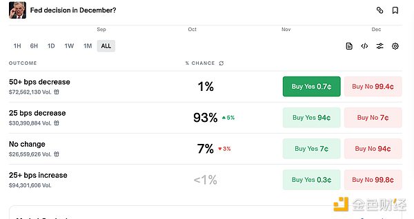케빈 해셋과 같은 잠재적인 "비둘기파" 연준 의장들이 등장하면서 트럼프 대통령은 연준이 금리를 인하해야 한다는 입장을 재확인했습니다. 그는 파월 의장에 대한 비판을 거듭하며 JP모건 CEO 제이미 다이먼조차 파월 의장이 금리를 인하해야 한다고 말했다고 지적했습니다. CME FedWatch에 따르면 12월 25bp 금리 인하 확률은 89.2%로 상승했고, 금리를 동결할 확률은 10.8%입니다. 1월까지 누적 25bp 금리 인하 확률은 66.6%, 금리 동결 확률은 7.7%, 누적 50bp 금리 인하 확률은 25.7%입니다. 또한, 폴리마켓 데이터에 따르면 다음 주 25bp 금리 인하 확률은 93%로 상승했으며, 예측 시장의 총 거래량은 2억 2,300만 달러를 넘어섰습니다.