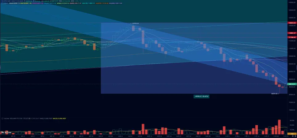 나스닥과 비교했을 때, 비트코인의 실적은 거시적 유동성과 주기적 매도세의 압박으로 더욱 참담했습니다. 지난주 5.25% 하락한 데 이어 이번 주에도 7.83% 폭락하며 주중 내내 5일 이동평균선 아래에서 거래되었고, 거래량은 지난주 대비 거의 두 배로 증가했습니다.