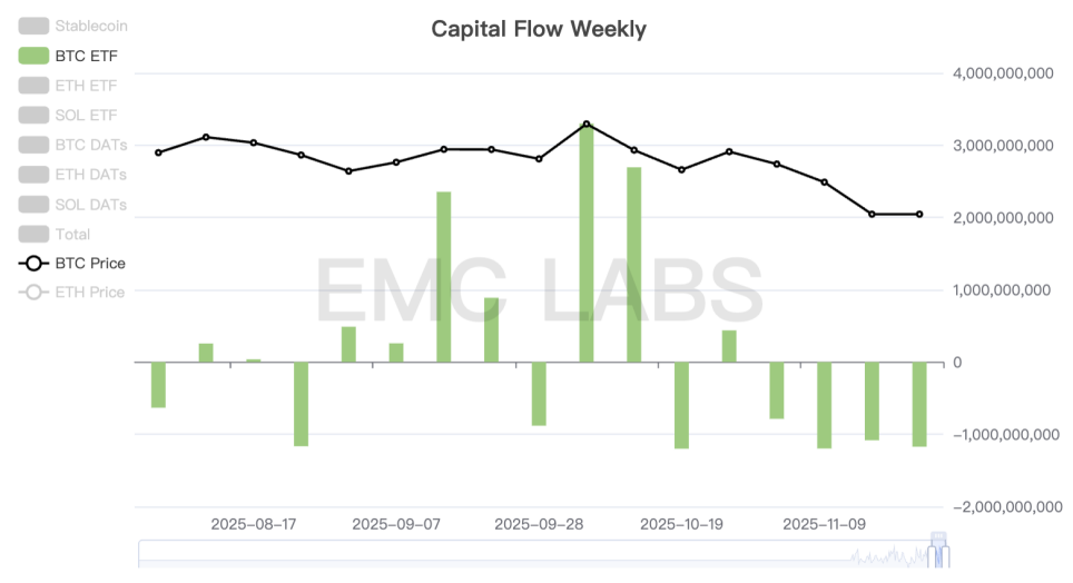 BTC ETF는 현재 강세장의 최소 두 차례 파동에 자금을 지원했습니다. 그러나 최근 유동성 위기와 지속적인 급락으로 인해 이러한 자금은 매도 압력으로 전환되어, 일주일 동안 11억 7,100만 달러가 유출되어 4주 연속 큰 폭의 하락세를 보였습니다.