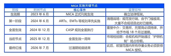 2025년 12월 말, EU의 암호화폐 시장 규제 체계(MiCA)가 완전 시행 1주년을 맞이합니다. 올해는 규제 시행뿐만 아니라 암호화폐 기반 기관과 기존 금융 기관이 공식적으로 같은 자리에서 맞붙는 첫 해이기도 합니다.