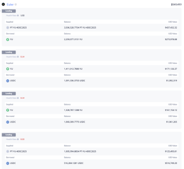 Dabank에서 더 흥미로운 데이터를 확인할 수 있습니다. 이 주소는 YU와 PT를 대량으로 담보로 Euler로부터 총 493만 달러의 USDT와 USDC를 빌렸습니다. YU가 0.15달러로 하락한 후 이 세 건의 대출은 사실상 채무 불이행 상태였습니다.