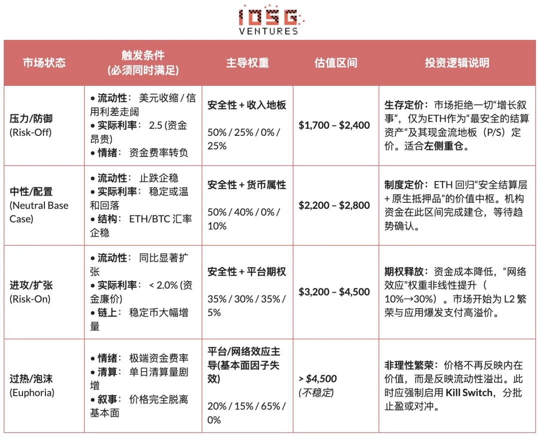 如果說前文確立了以太坊的“內在價值中樞”,本章則引入一套獨立於基本面的“外在環境適配系統”。估值無法真空運行,必須受制於宏觀環境(資金成本)、市場結構(相對強弱)與鏈上情緒(擁擠度)三大外部約束。基於此,我們建立了狀態適配(Regime Adaptation)機制,在不同周期動態調整估值權重-寬鬆期釋放選擇權溢價,避險期退守收入地板,從而實現從靜態模型到動態策略的跨越。 (註:限於篇幅,本文僅展示此機制的核心邏輯架構。)