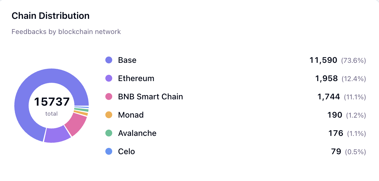 但從真實互動情況來看,生態仍處於早期階段。截至目前,累計回饋數約為1.5萬條,平均每個Agent獲得不足1條。這意味著,多數Agent仍處於冷啟動階段,實際使用與使用者互動相對有限。不過,Base獲得的回饋數量佔比高達73.6%,遠超以太坊、BNB Chain、Avalanche等網絡,這意味著當前實際互動與活躍場景正在向Base集中。這或與近期爆火的OpenClaw點燃了Base上的Agentic生態熱潮有關。