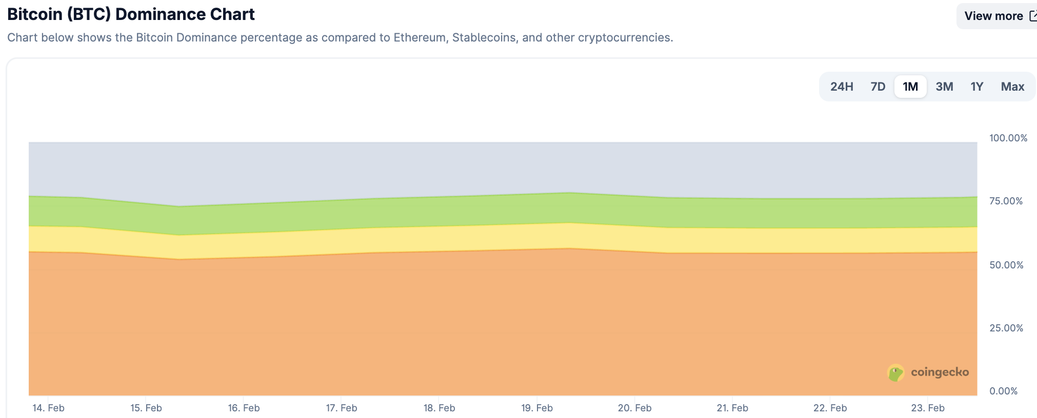 截止至发稿,比特币的市值为1.28万亿美元,占加密货币总市值的55.65%。与此同时,稳定币的市值为3,049亿美元,占加密货币总市值的13.25%。