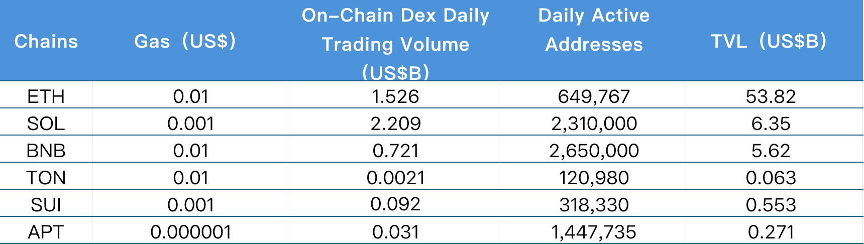 主要从日交易量、日活跃地址、交易费用分析目前主要Layer1含ETH、SOL、BNB、TON、SUI以及APTOS的相关数据。