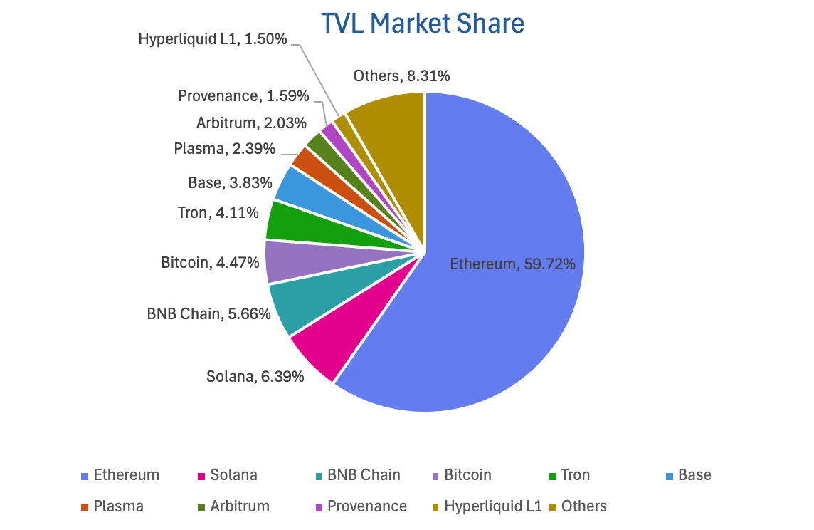 用户活跃度方面,Solana(231 万,+3.59%)、BNB Chain(265 万,+1.53%)和 Aptos(144 万,+7.97%)日活小幅增长,而以太坊(65 万,-3.19%)、Sui(31.8 万,-12.51%)与 TON(12 万,-12.03%)回落。TVL 整体小幅下滑,其中以太坊仍以 538.2 亿美元居首(-1.55%),Solana 为 63.5 亿美元(-3.92%),BNB Chain 为 56.2 亿美元(-3.02%),其余链均出现 3%–7% 不等的回调,