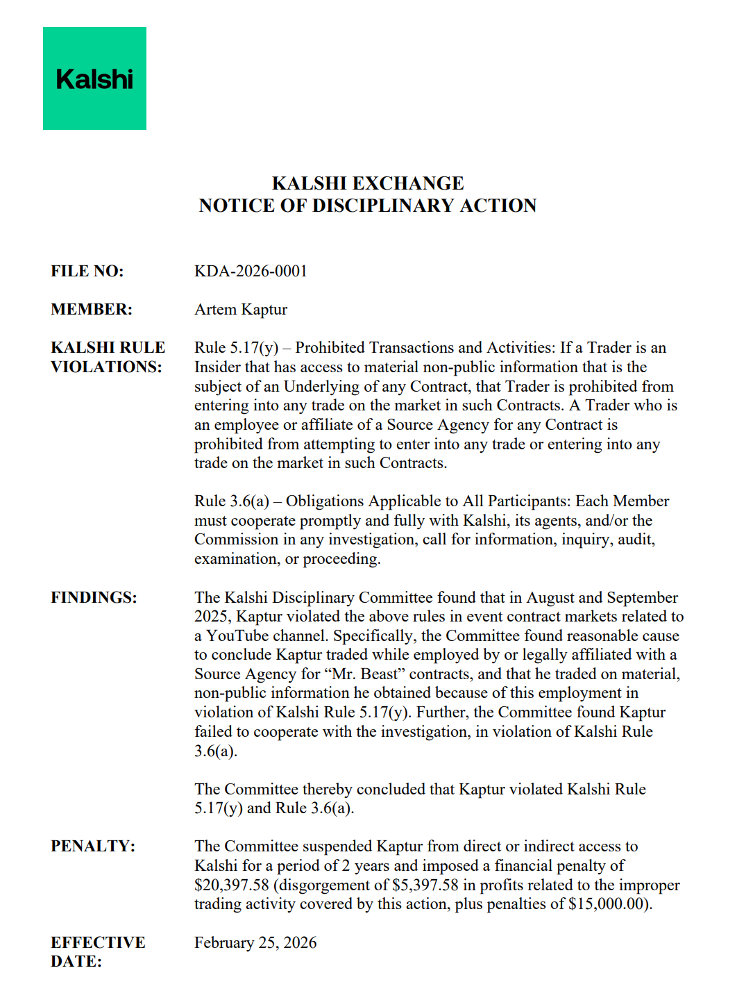 根據Kalshi發布的紀律通知,Kaptur在2025年8月至9月期間,利用其在Beast Industries的職務之便交易了與MrBeast頻道相關的事件合約。