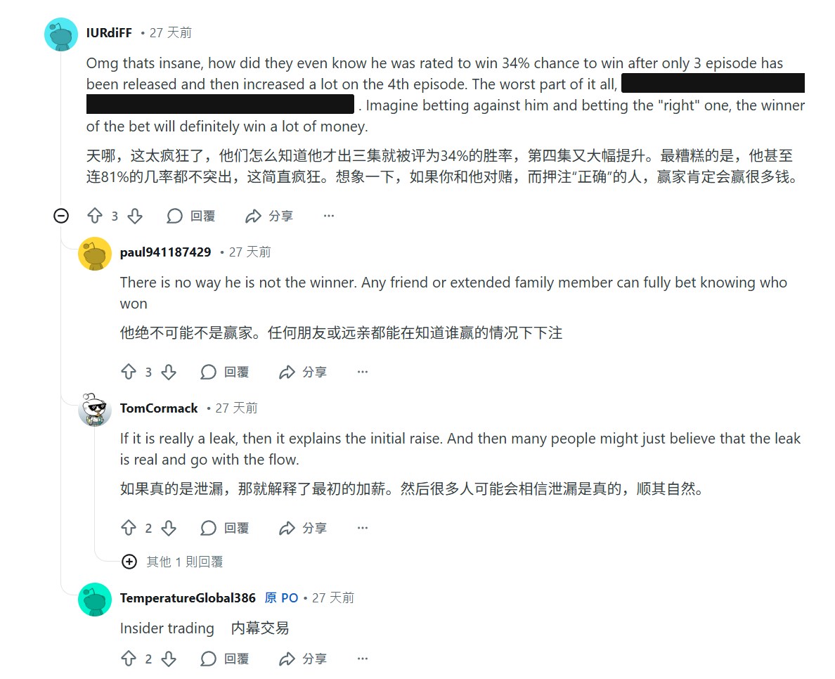 Reddit的社群和Polymarket評論區對此早已炸鍋。 "冠軍基本上被Polymarket劇透了",多個帖子的標題直截了當地指出了這一點。社群成員將其與第一季冠軍Jeff Allen被提前洩露的情況做了類比,而這次的資料模式更加露骨。