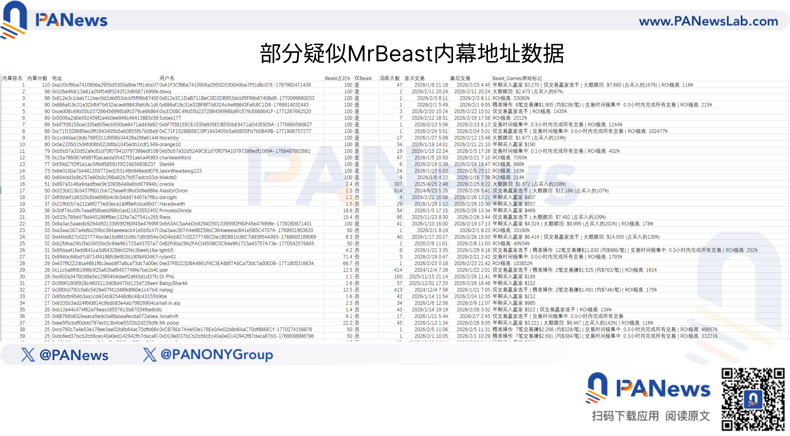 那麼,誰有能力在賽季中期就以如此確定的方式下注?資訊來源指向非常有限的幾個群體:Beast Industries龐大的後製團隊,參與錄製的200名選手本人及其親密社交圈,以及參與排片和宣讀的工作人員(調查中發現有多個地址專注於影視類合約有著奇高的勝率)。 Kalshi上Kaptur的交易只有4000美元,賺了5000多美元。但在Polymarket上,光是PANews追蹤到的Top疑似內線地址累計獲利就已超過10萬美元,而這很可能只是冰山一角。