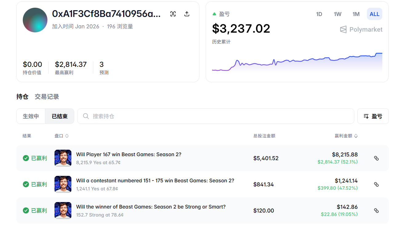 這16個地址中,嫌疑最高的地址名為"0xA1F3Cf8Ba7410956a2955D5300A9be7Ff1dBc07E-1767992471439",僅參與了3個Beast Games子市場,全部獲利,100%,439",僅參與了3個Beast Games子市場,全部獲利累計3237美元。類似的地址有多個,雖然單一獲利並不高,但操作上呈現出高度類似的情況。這意味著內線交易者可能故意透過分散下注的方式來降低關注度。