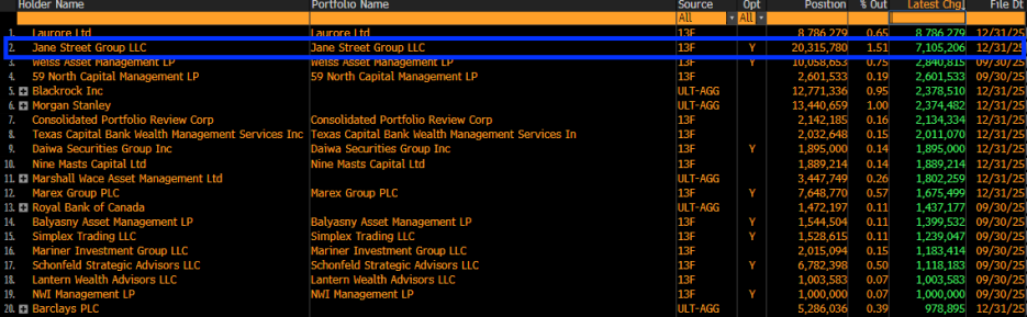 Jane Street 提交的13F 持倉報告顯示,其在2025 年第四季大幅增持了超過710 萬股貝萊德現貨比特幣ETF (IBIT),總持倉達到2,031.5 萬股,價值約7.9 億美元。