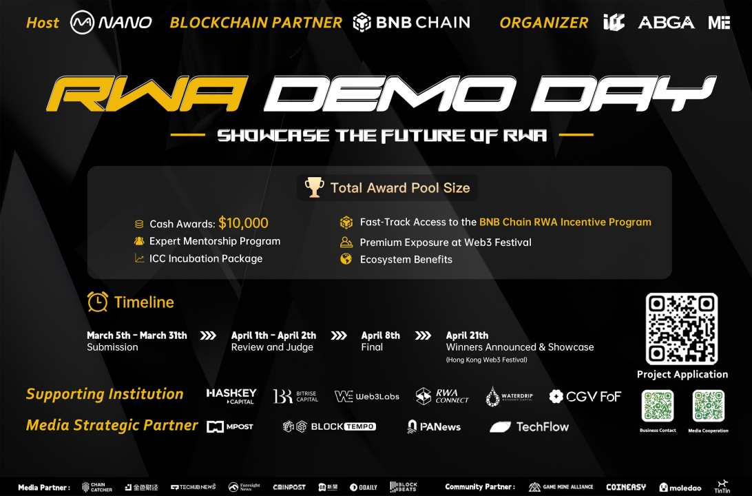 隨著現實世界資產(RWA)加速進入鏈上體系,區塊鏈正從數位資產基礎設施,邁向全球資產發行與流通的新底層網路。在這一背景下,由Nano Labs 主辦、BNB Chain 作為官方公鏈合作夥伴,ICC 、 ABGA 、ME聯合承辦,MPost、Blocktempo、PA News、TechFlow 戰略媒體支持,並攜手Hashkey Capital、Bitrise Capital、RWA Connect、Web3 Labs、Waterdrip Capital Capital、cgv DeWAman Capital、RWA Connect、Web3 Labs、Waterdrip Capital、cgvD. DeWA 機構共同發起的全球專項招募。