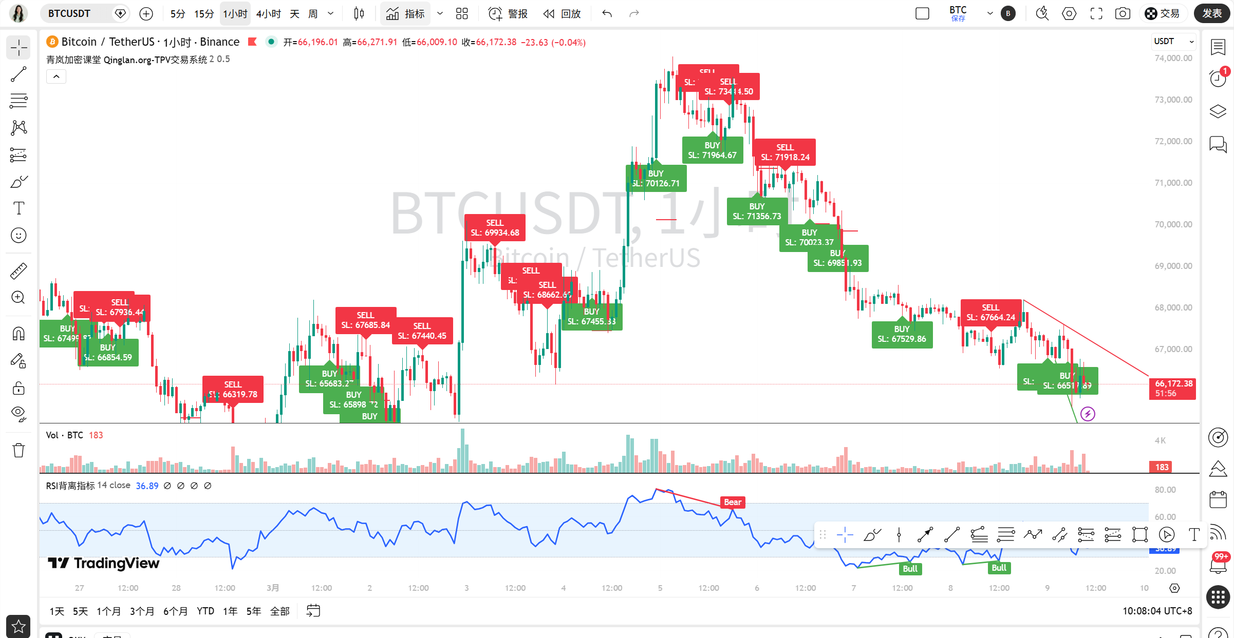3/9 比特币遭地缘避险情绪与合约爆仓潮双重打击,日线、4 小时均呈空头趋势,凌晨急跌后弱势整理。短线 66000-66600 区间震荡,建议逢高做空;中长线勿抄底,紧盯 65000 支撑与 67300 突破情况,严控仓位与止损。