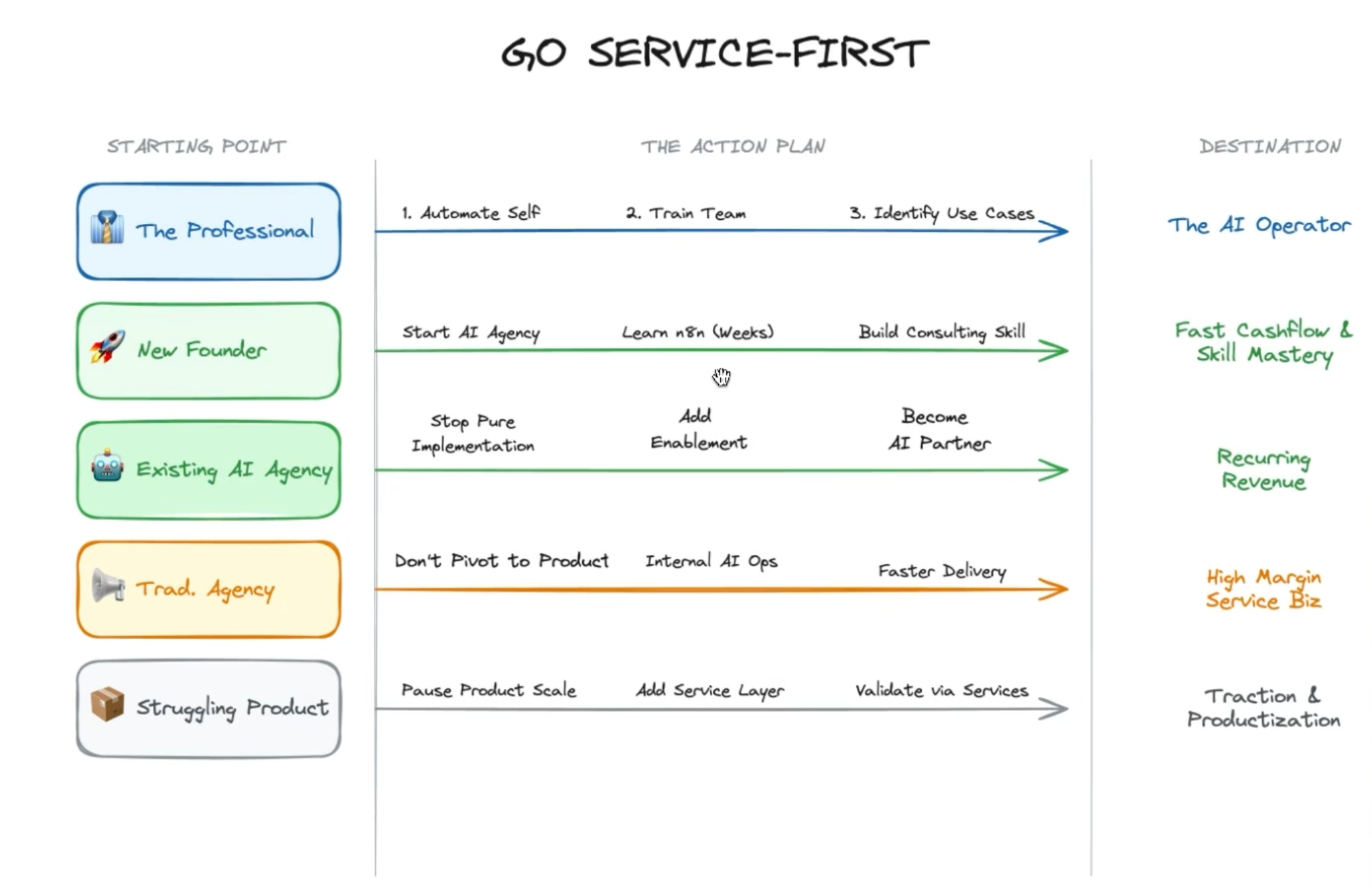 如果你是現有的服務機構,例如行銷機構或潛在客戶開發機構,或是在這類領域有經驗,你也處於一個很好的位置。不要因為外面的炒作而猶豫是否要轉向AI agency或建立AI產品業務。如果你能夠在內部利用AI來提供企業行銷或潛在客戶開發服務,你就能建立一個非常好的高利潤率業務。關鍵是要認識到AI可以大幅降低你的交付成本,而不是完全改變你的商業模式。